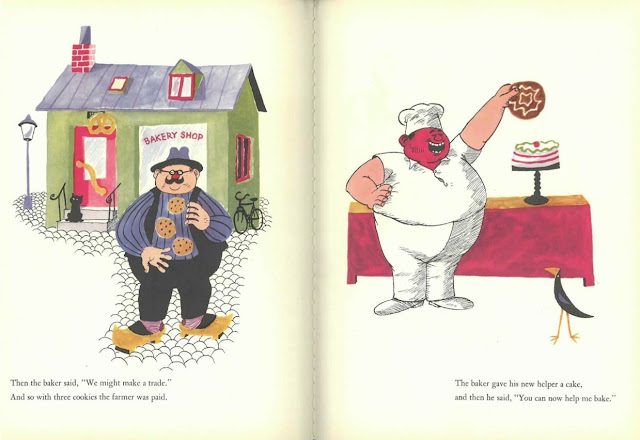 We won't spoil the end of the story for you, but as you can see from the glorious page spreads shown above, this really is a true children's classic in ever sense of the word. The rhymes may have suffered in translation in a couple of places but still work beautifully. The artwork is from that era of children's books where the bold and larger-than-life characters really help drive the story along (and can't you almost taste those pretzels in the book spread above?)
